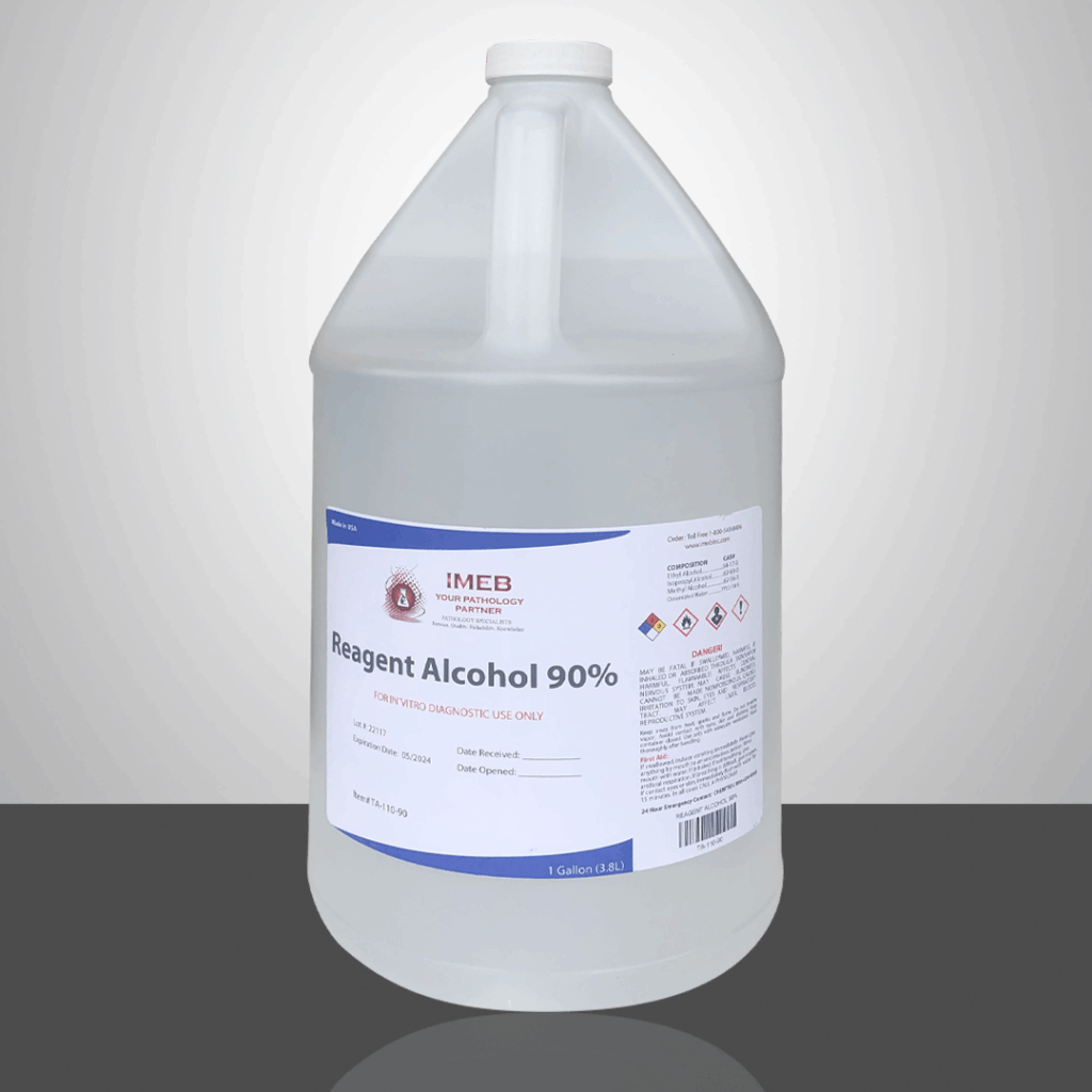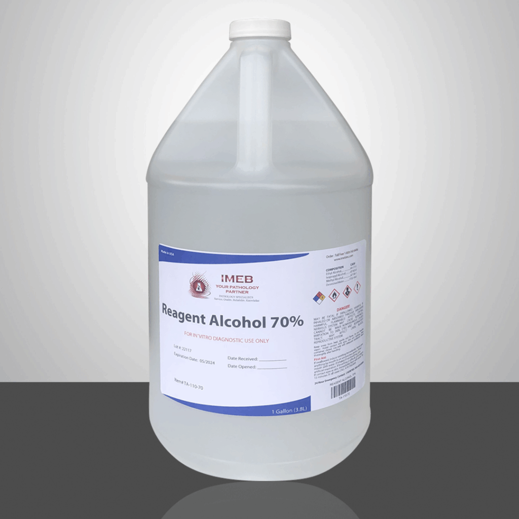 IMEB Reagent Alcohols are ACS reagent grade, anhydrous, absolute (200 proof; 95 parts of specially denatured ethyl alcohol 3A with 5 parts of isopropyl alcohol). These alcohols are ideal for tissue processing and all Histology and Cytology staining procedures in the Lab. Highly filtered, plus IMEB’s quality controls ensure consistently high quality.
