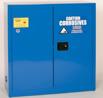 Acid & Corrosive Safety Cabinet Model CRA-32 is a Standard 30-gallon safety cabinet (CRA32) with 1 shelf. Constructed of 18-gauge steel, the sides, top, bottom, and doors are double-walled with a 1 1/2″ air space between walls. Both vents, with 2″ threaded fittings, have a fire baffle and cap. Cabinets come in blue high gloss powder finish with warning labels, grounding connection, 3-point key lock, and 2″ raised, leakproof door sill. Each shelf is adjustable and can support 350 pounds. Not recommended for use with Sulfuric, Nitric, or Hydrochloric Acid. (EAGLE Poly Acid-Corrosive Cabinets are suitable for use with these acids). Cabinets meet NFPA Code 30 and OSHA requirements and are FM-approved.