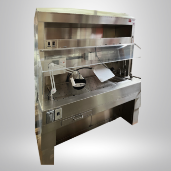 This Mopec elevating grossing station is constructed of stainless steel. The elevating design is fully customizable. The station includes lights, a pullout table, a sink, and a movable lamp. We offer this refurbished model at an affordable price.