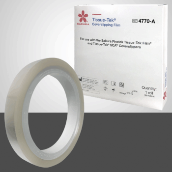 This coverslipping film is the 5th generation made from resin-coated plastic film. The film eliminates the need for coverglass and liquid mounting mediums. Compared to mounting medium and glass coverslips, it reduces coverslipper maintenance and enables fast coverslipping.