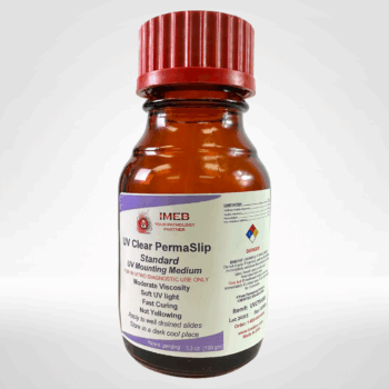 • Apply the proper amount (a few drops) of Tek-Select UV Clear Slip Mounting Medium from the application bottle to your stained slides in your manual coverslipping operations. Note: Tek-Select UV Clear Slip mounting can be fitted (with a few modifications) to use with automated glass coverslippers such as the Leica 5030 Coverslipper or the Sakura Glas-Coverslipper G-2. Please contact IMEB INC for information on how to modify your glass coverslipper to Tek-Select UV Mounting Medium for xylene-free use and 30-second drying.